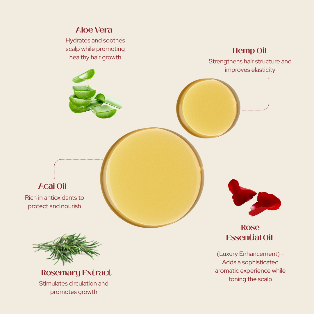 - Rose Essential Oil - Adds a sophisticated aromatic experience while toning the scalp